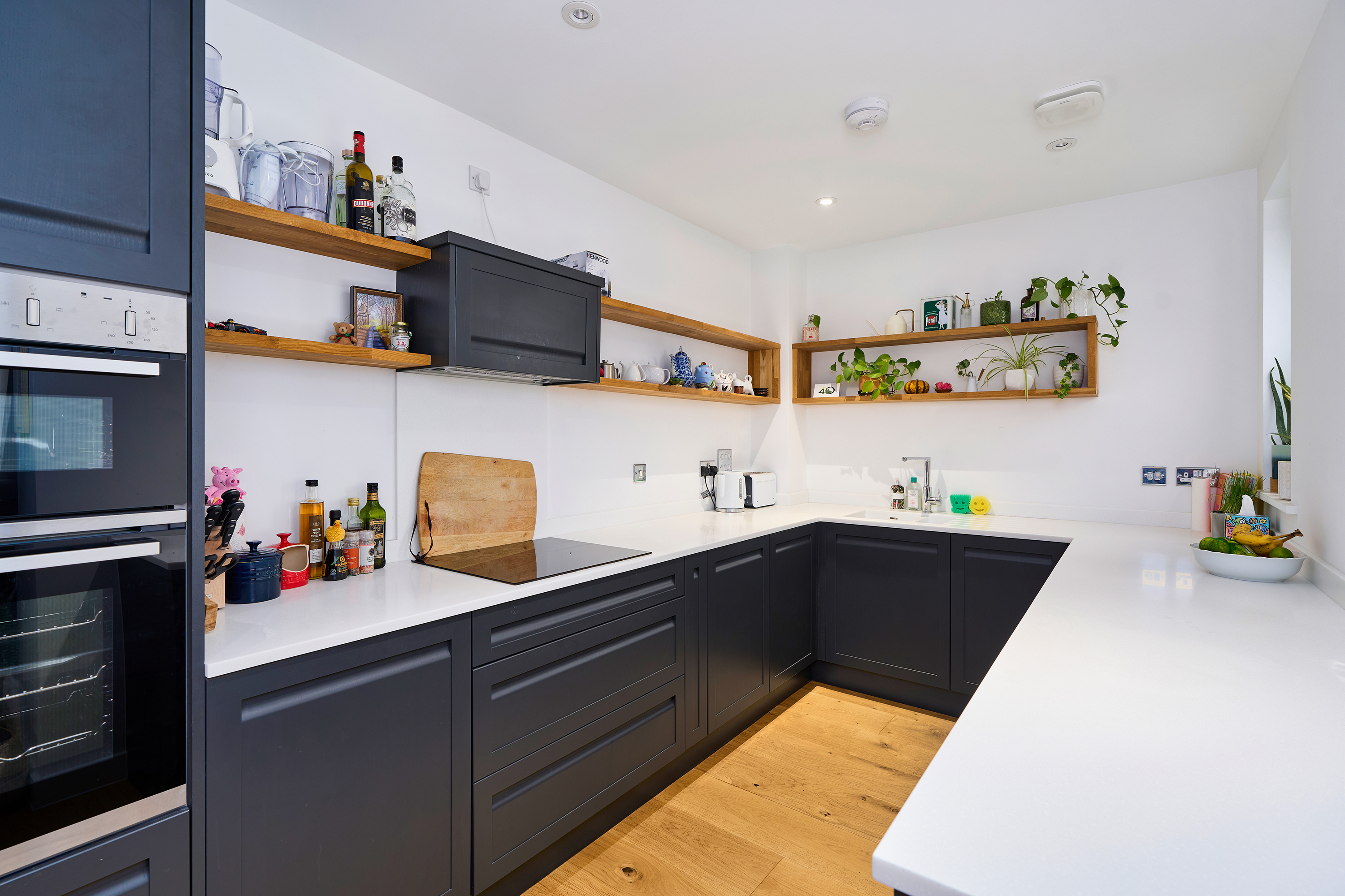 with contemporary floor and wall mounted units, granite work surfaces, wood flooring and wooden shelving. integrated appliances include fridge/freezer, double oven, dishwasher and washer/drier