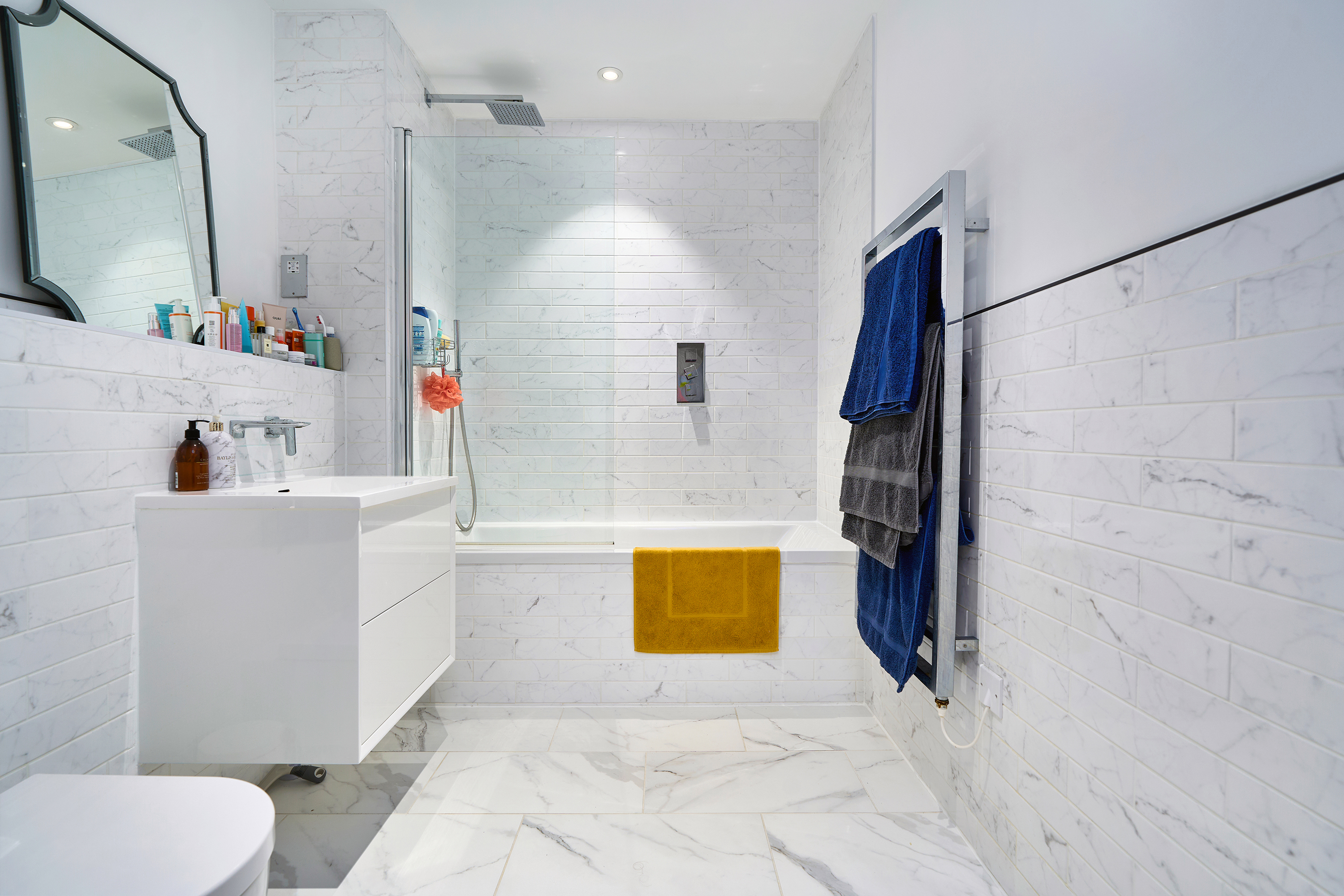 with contemporary white suite comprising bath with shower over, wash hand basin with vanity under, w.c. and marble tiling