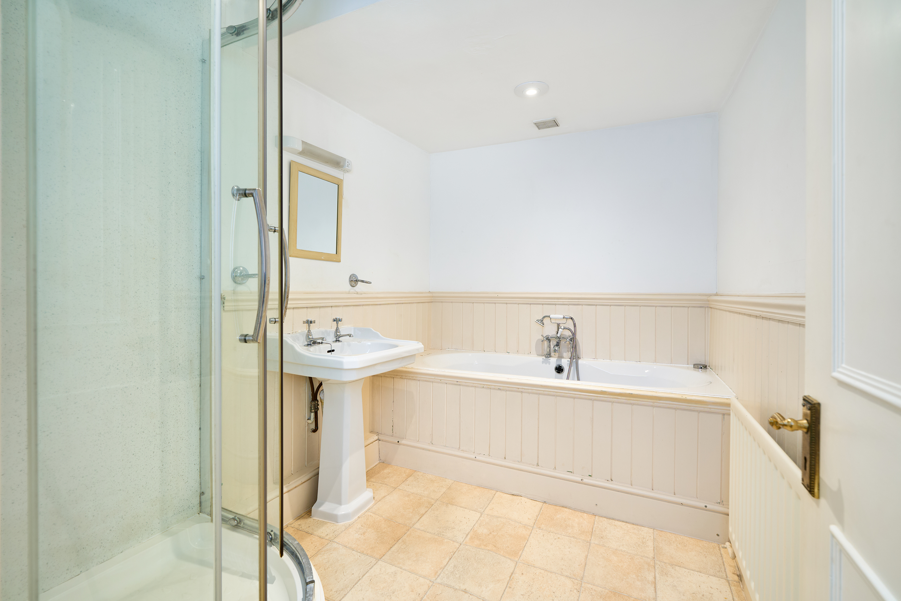 With pedestal sink, shaver point with light over, corner shower unit with thermostatic shower, mixer tap and aquaboard backing, bath with mixer tap and telephone shower attachment, wooden panelling throughout, single panelled radiator, downlighting, vinyl flooring and double extractor fan.