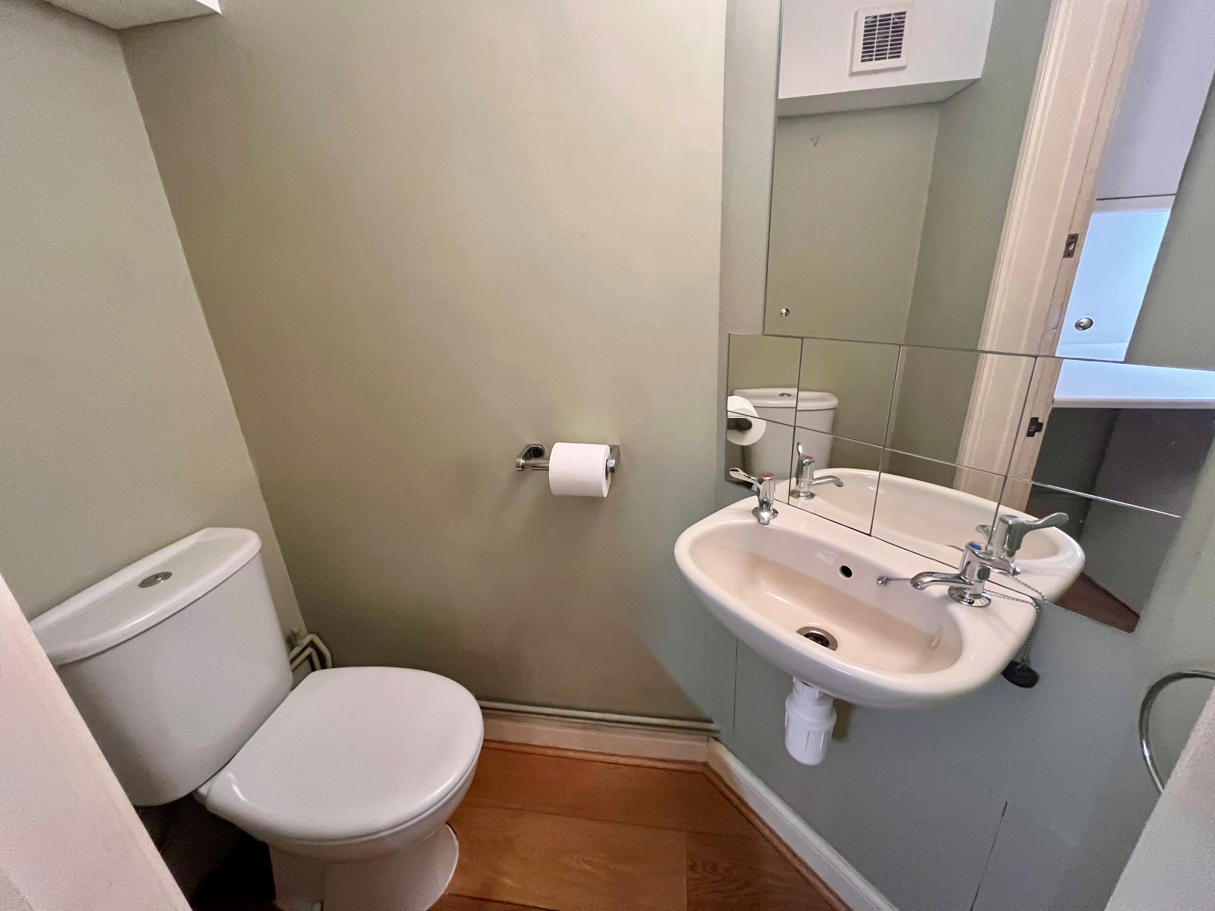 solid oak flooring continues, white WC and wash hand basin, mirror, light, extractor fan