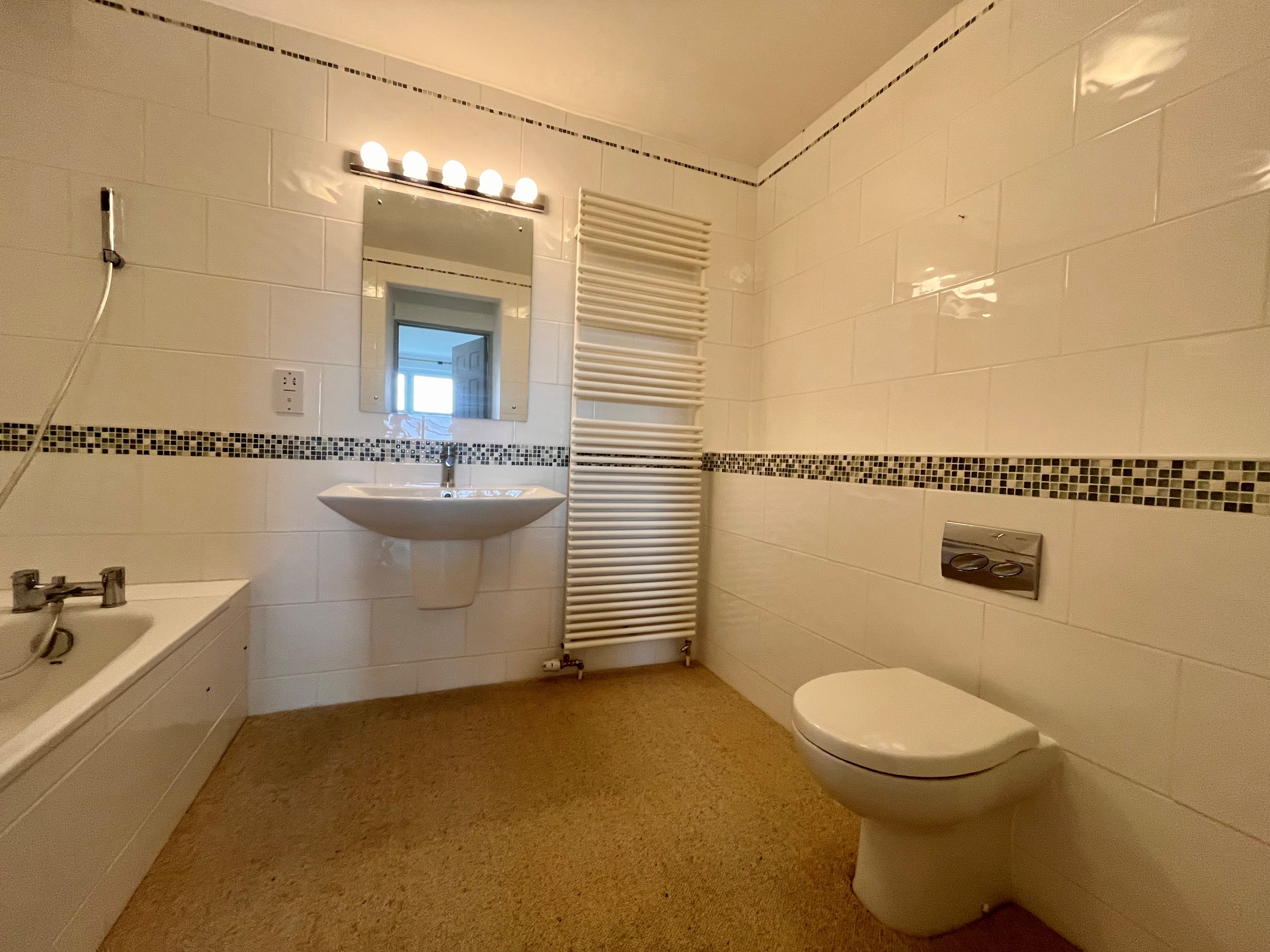 carpeted, fully tiled walls, white bathroom suite comprising of a bath with a handheld shower over, a Sottini wash hand basin with chrome mixer tap, WC, extractor fan, ceiling and wall lighting, shaver socket, mirror, white ladder style towel rail