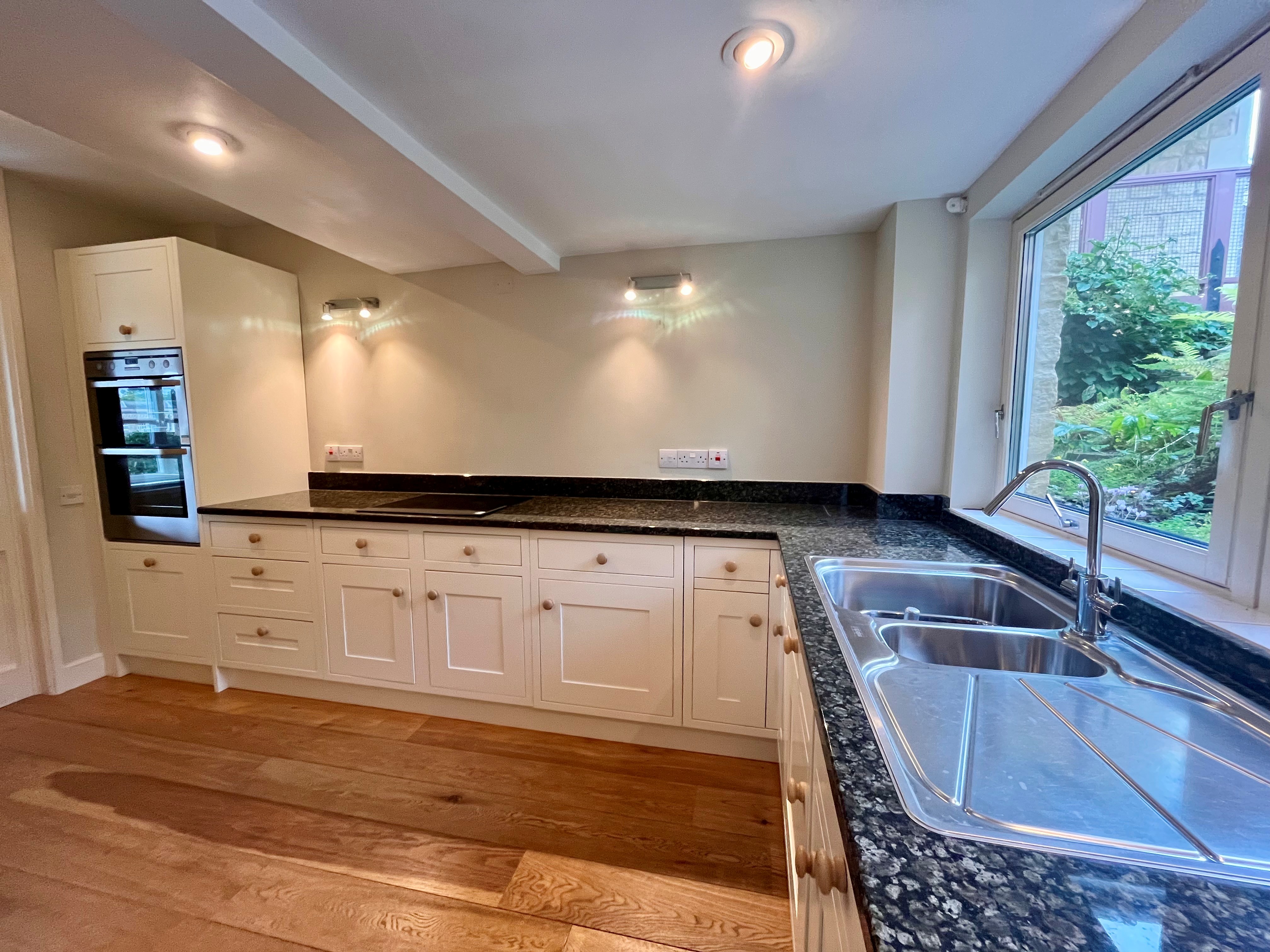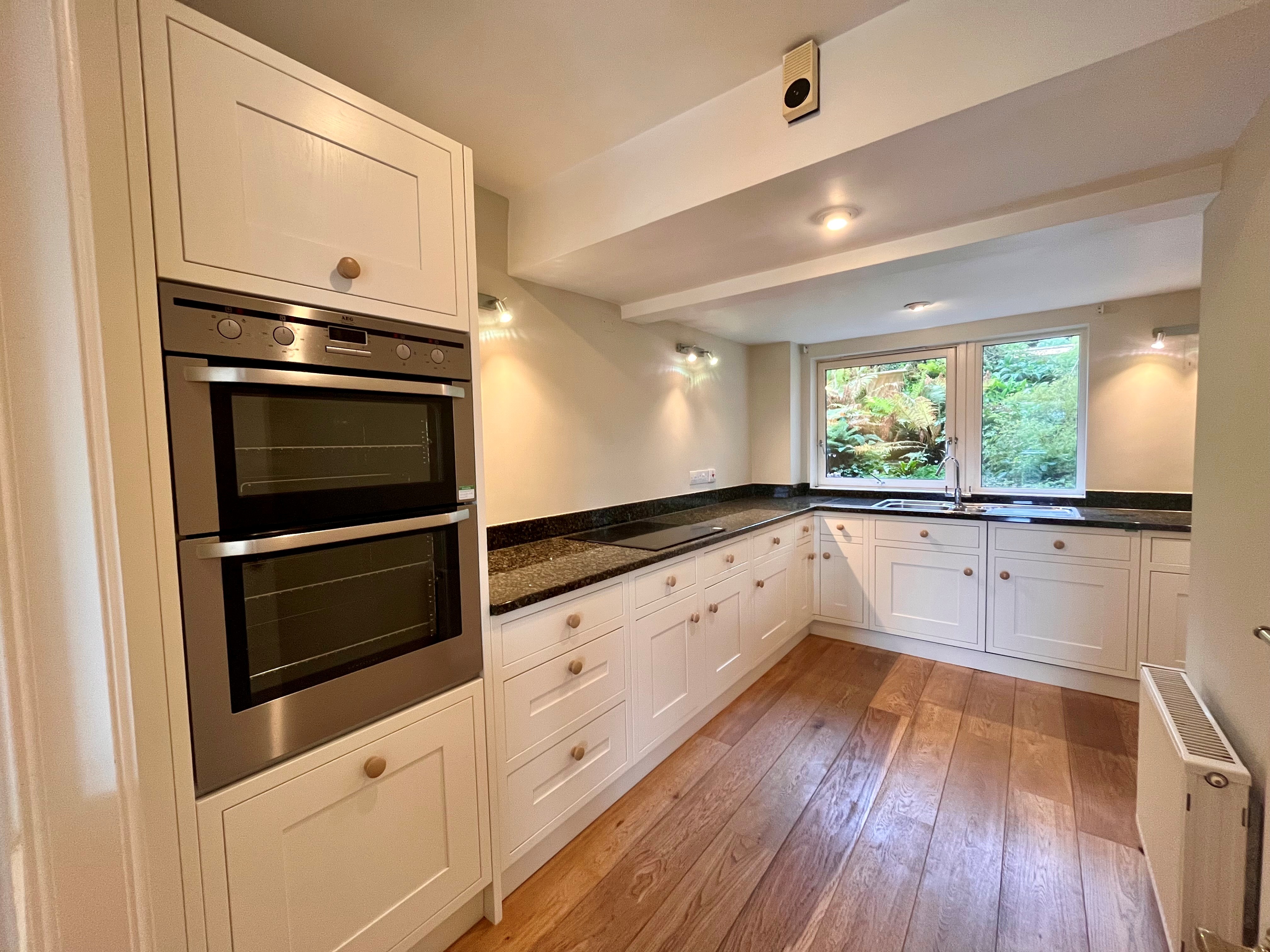 solid oak flooring continues, with cream shaker style kitchen units, oven housing unit with an AEG integrated double oven, integrated Beko dishwasher, integrated fridge, black granite style laminate worktops over, with a Frankie 1 ½ bowl sink with chrome mixer tap over, wooden double glazed window to front overlooking the sunken garden area, white panelled door leading to under stairs cupboard with shelving and light, further white panelled leading to