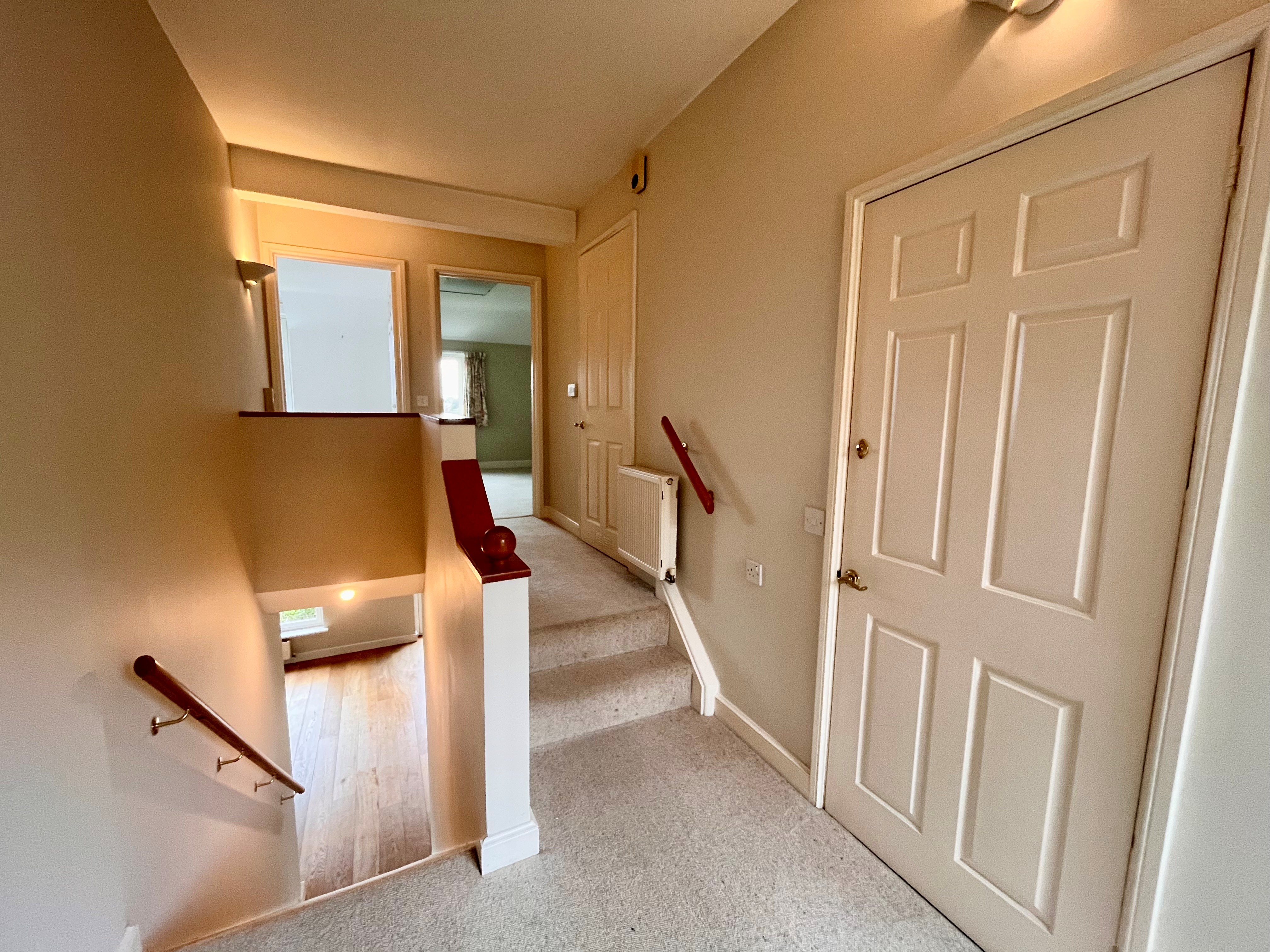 Stairs rising to first floor bedrooms, radiator, wall light, British Gas digital programmer for heating and hot water, large airing cupboard with light, shelving and hanging space, white panelled door open to