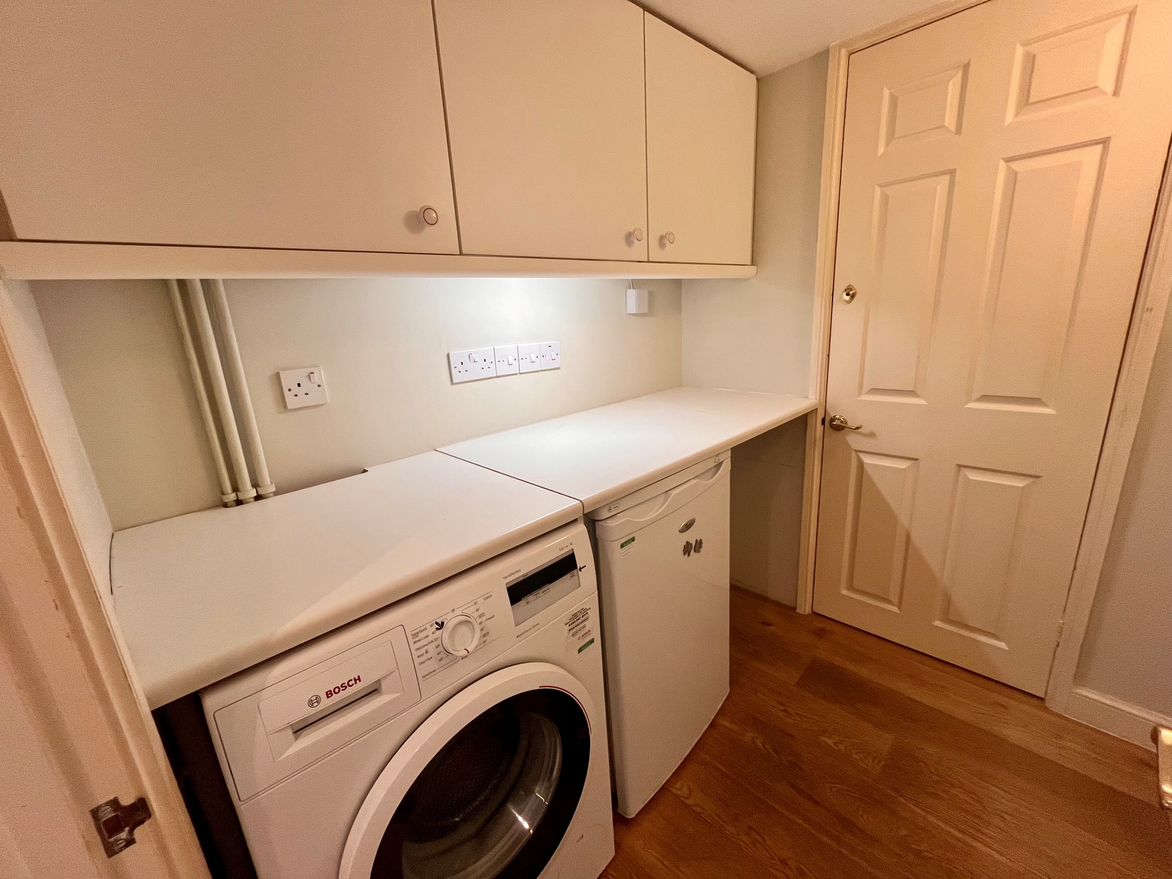 solid oak flooring continues, with Bosch washing machine, Whirlpool freezer, space for a dryer, white wall cupboards and white worktop, counter top lighting, radiator, panelled door into