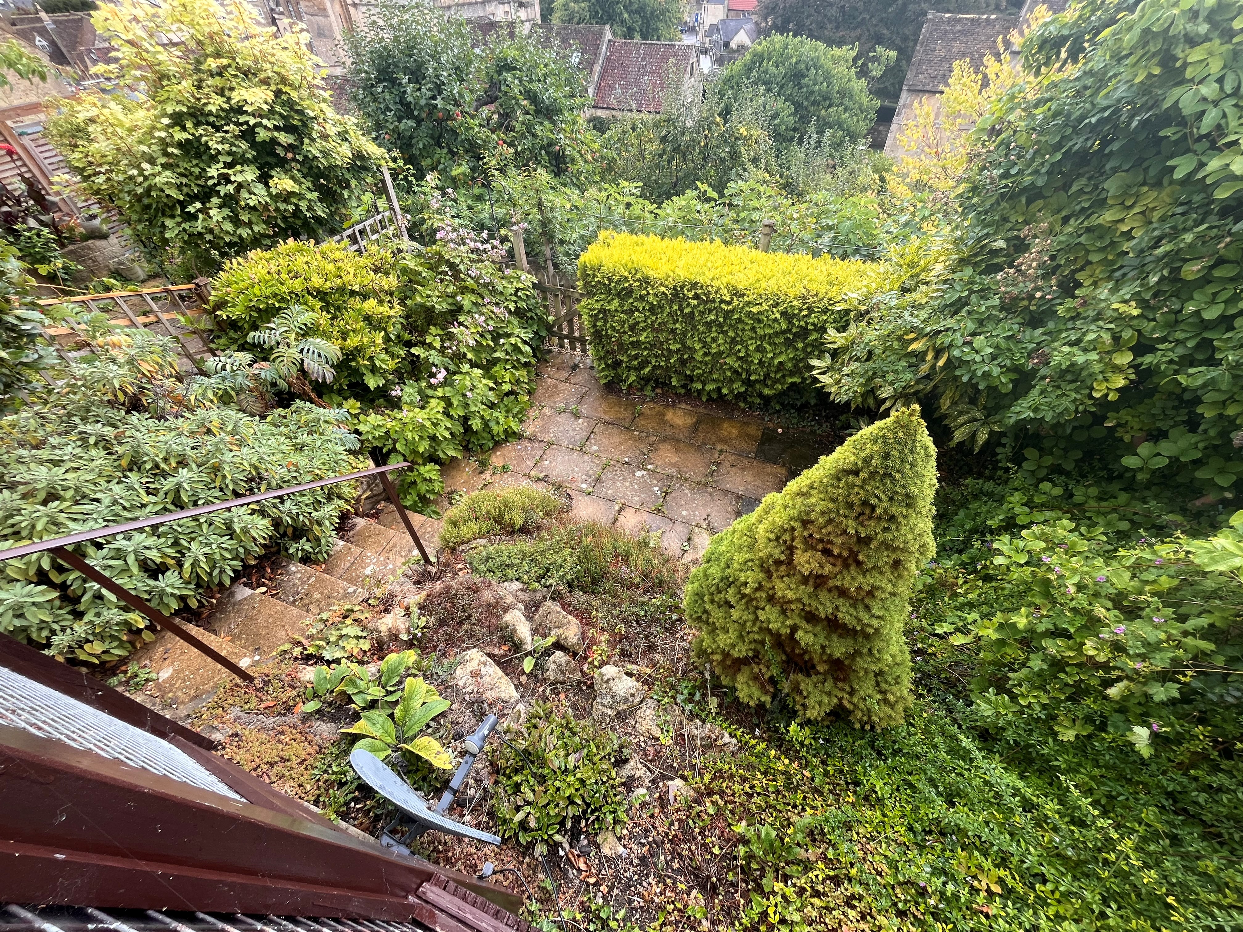 from the pedestrian door in the lounge steps descend to the courtyard garden with patio area and various mature shrubs, outside light, outside tap, pedestrian gate provides walk way access to the communal gardens and Church Street