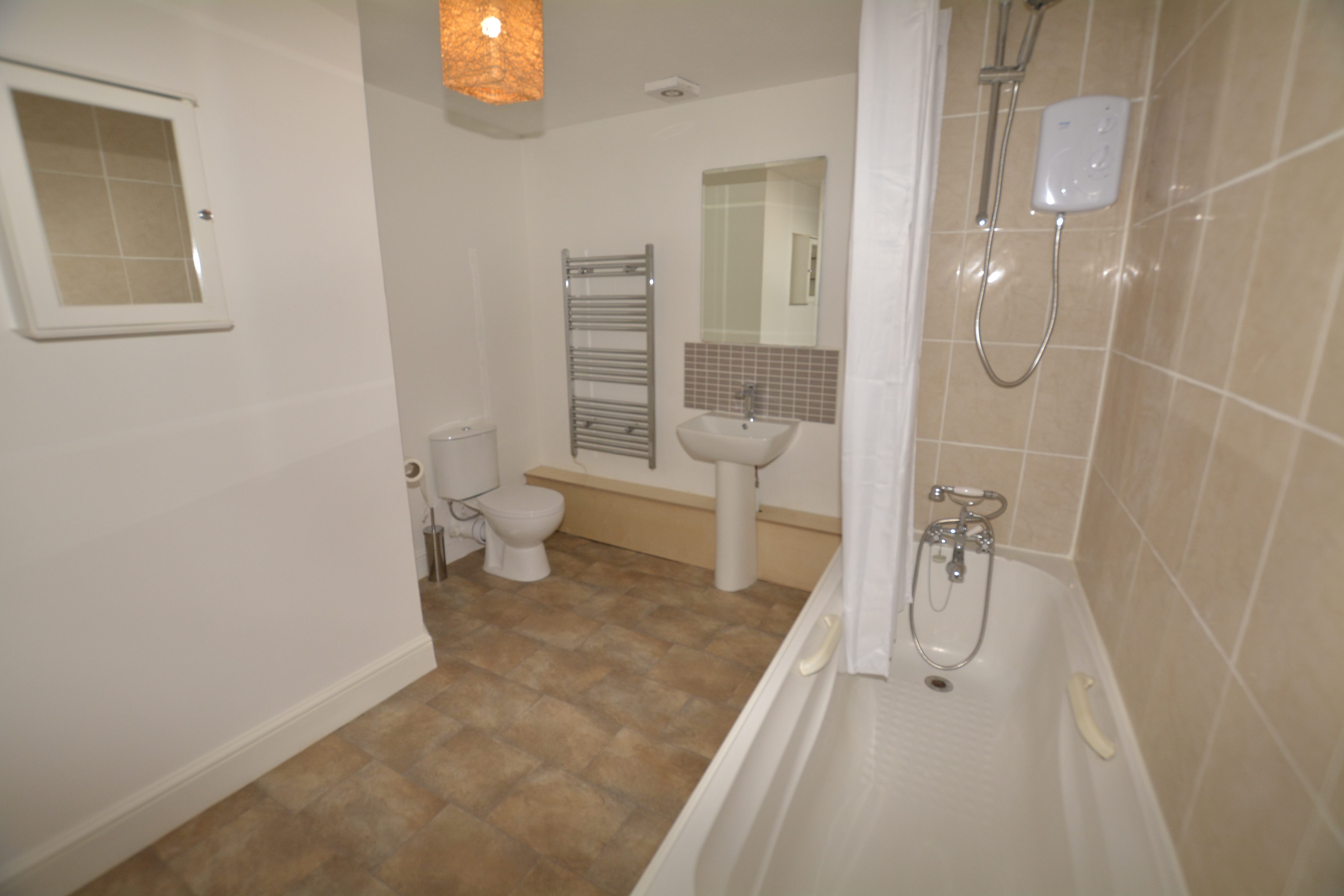 Bathroom with white suite comprising bath with newly fitted shower over, wash hand basin and w.c.