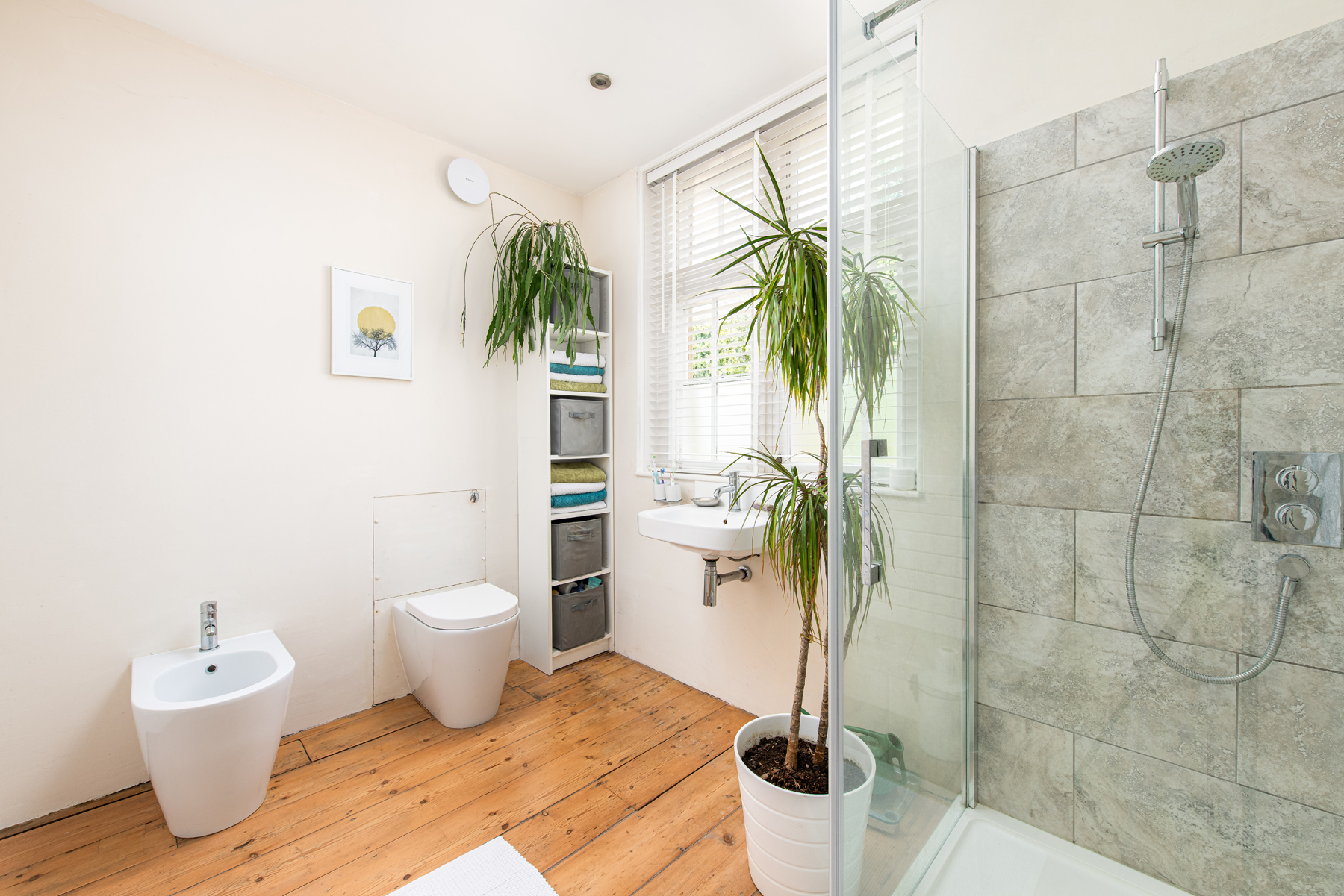 with varnished wood flooring, front aspect window, toilet, bidet, shower, radiator, built in storage.