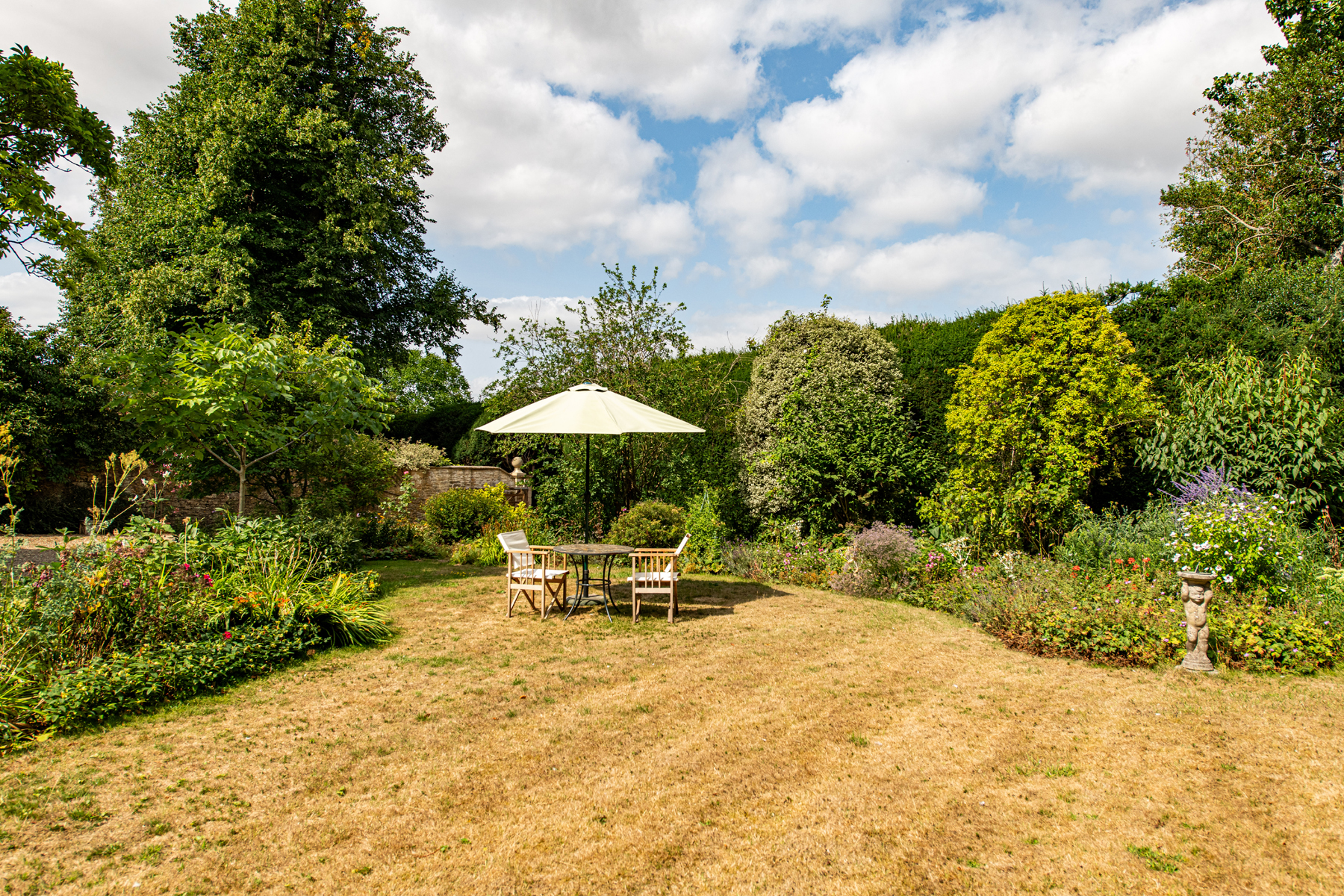 Externally, the property is set within beautifully landscaped gardens of approximately half an acre, offering a high degree of privacy, surrounded by mature trees and established greenery. Accessed via a private driveway and enclosed by charming walled gardens, the grounds feature an array of specimen trees and shrubs, generous parking for multiple vehicles, and a detached double garage equipped with two EV charging points.