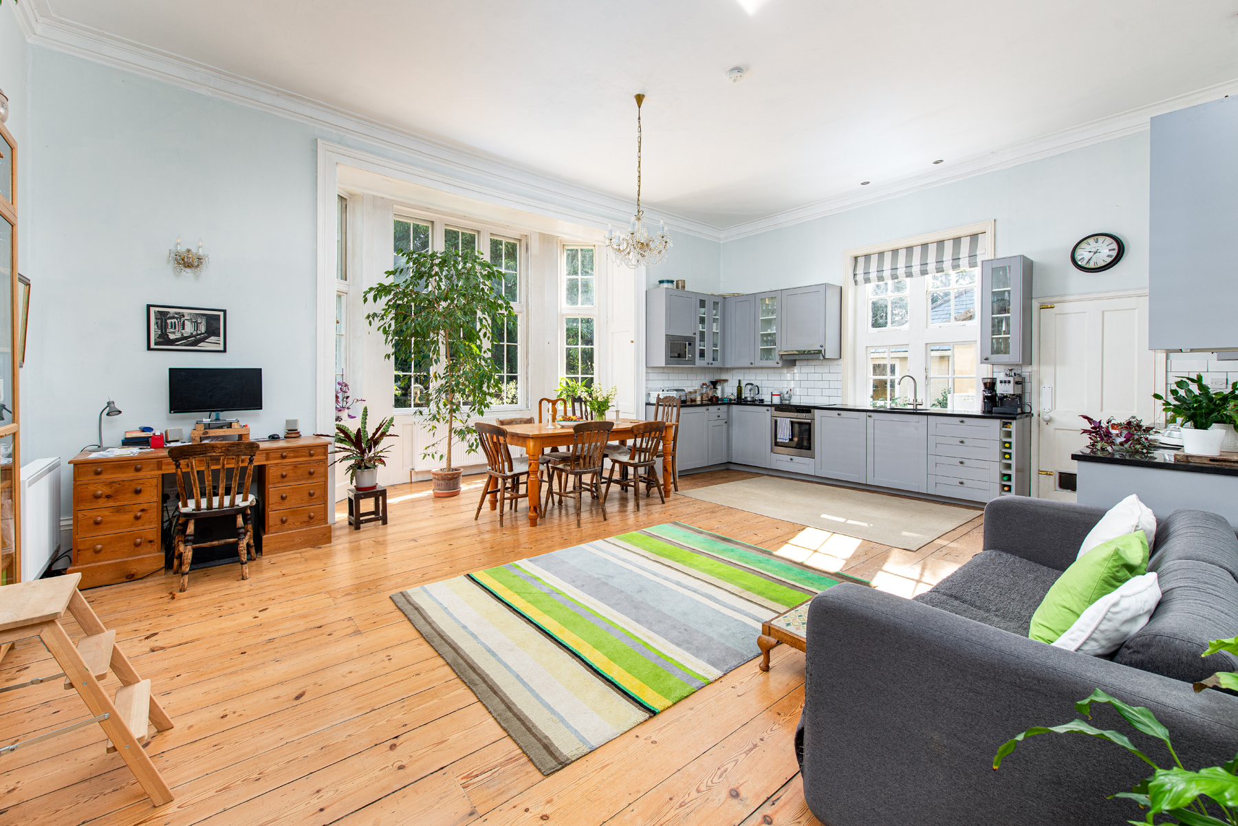 A striking stone-arched open porch opens into a welcoming vestibule, leading through to an impressive double-height entrance hall, where the original staircase rises gracefully to the first floor. The elegant drawing room offers superb proportions, featuring a tall, coved ceiling, an exquisite central fireplace, a front-facing bay window, and twin sash windows framing views over the delightful gardens. The open-plan kitchen and dining room continues the theme of elegant proportions, featuring a further impressive bay window that floods the space with natural light and offers picturesque views over the gardens. The modern kitchen is beautifully appointed and perfectly complemented by a classic Aga, adding both charm and functionality. The ground floor is completed with a cloakroom, studio, utility space and access to the cellar below.